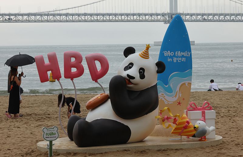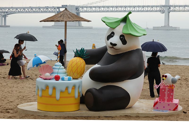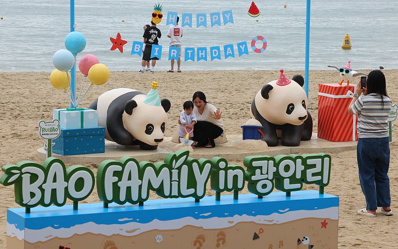 当地时间2024年7月9日,韩国釜山,广安里海水浴场设置大熊猫“宝家族”造型物,吸引了国内外避暑游客的视线。大熊猫家族模型将展示到今年8月31日。