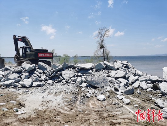 7月6日,湖南省岳阳市华容县团洲垸洞庭湖一线堤防决口附近,湖堤上堆满用于封堵决口的石块。为将226米的决口封堵合龙,当地紧急从周边县市区以及常德、益阳、长沙等地调拨5.56万吨块石。7月8日22时31分许,华容县团洲垸洞庭湖一线堤防决口完成合龙。中青报·中青网记者 洪克非/摄
