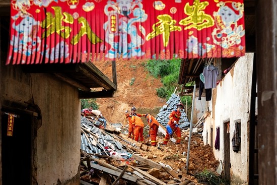 6月18日,广东省梅州市,应急消防队员在平远县泗水镇大新村倒塌的民房进行搜救。6月16日,广东梅州出现大暴雨,局部特大暴雨,全市多地受灾严重。视觉中国供图