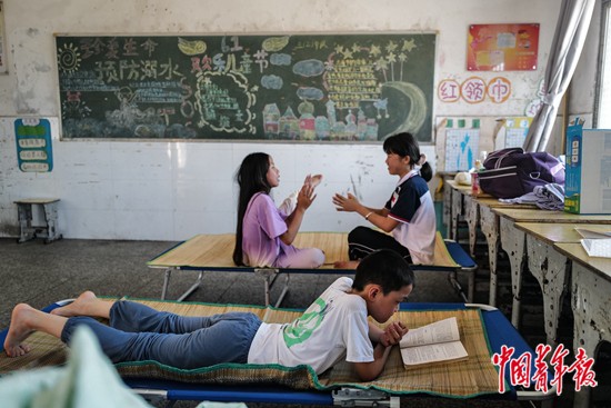 7月4日,江西省九江市,永修县艾城镇中心小学集中安置点,12岁的廖潜龙(前)在看书。他来自阳山村,7月1日和家人来到这里。中青报·中青网记者 赵迪/摄