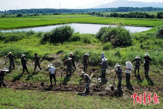 7月4日,江西省九江市永修县艾城镇,民兵在抢险挖沟导渗。中青报·中青网记者 赵迪/摄