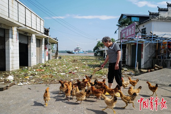 7月3日,江西省九江市柴桑区江洲镇,66岁的张金梅在喂鸡。她身旁的建筑在洪水中受灾。中青报·中青网记者 赵迪/摄
