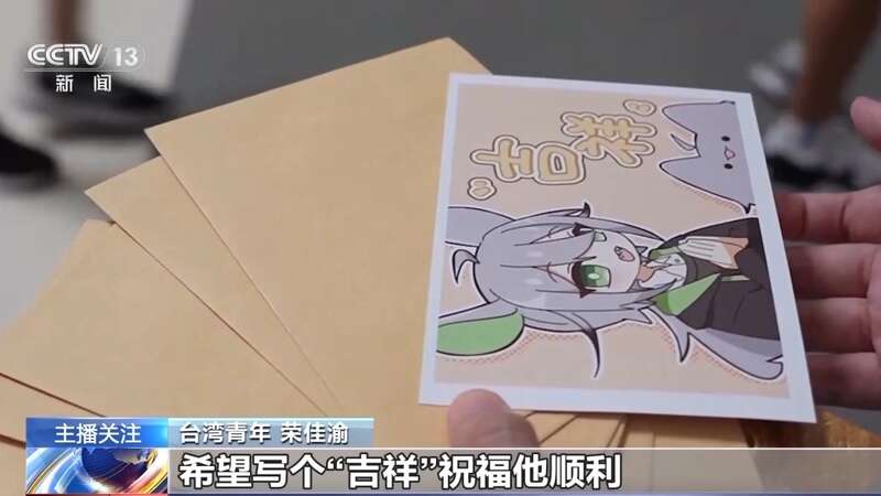 台湾青年 荣佳渝:他跟我在介绍一些瓷器之类的,可以源源不断在那边讲,我就觉得好厉害,当然也会希望继续跟他交流,因为卡片是比较有心意的东西,我就想自己手画交给对方,写个“吉祥”祝福他顺利。