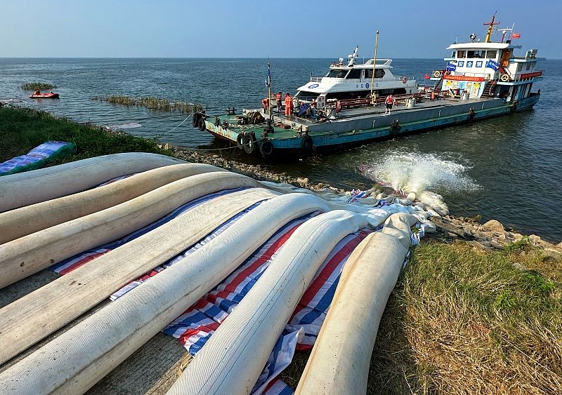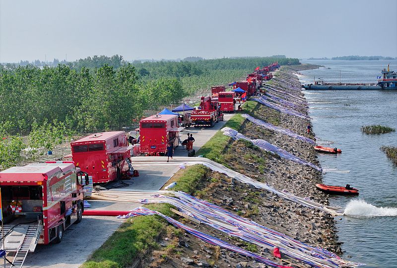 2024年7月10日,湖南岳阳,华容县团洲垸内排涝工作正在持续进行,多方力量抢抓时间,加快恢复生产生活秩序。当日17时垸内水位32.93米,比昨日8时下降0.15米。