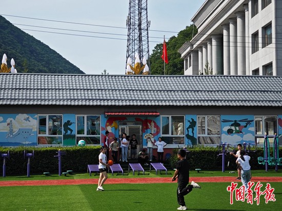 宽敞的校园里,灰墙蓝瓦的教学楼正对着乡镇主干道。楼前红绿相间的塑胶操场上,孩子们赶在放学回家前再和小伙伴跑上几圈。