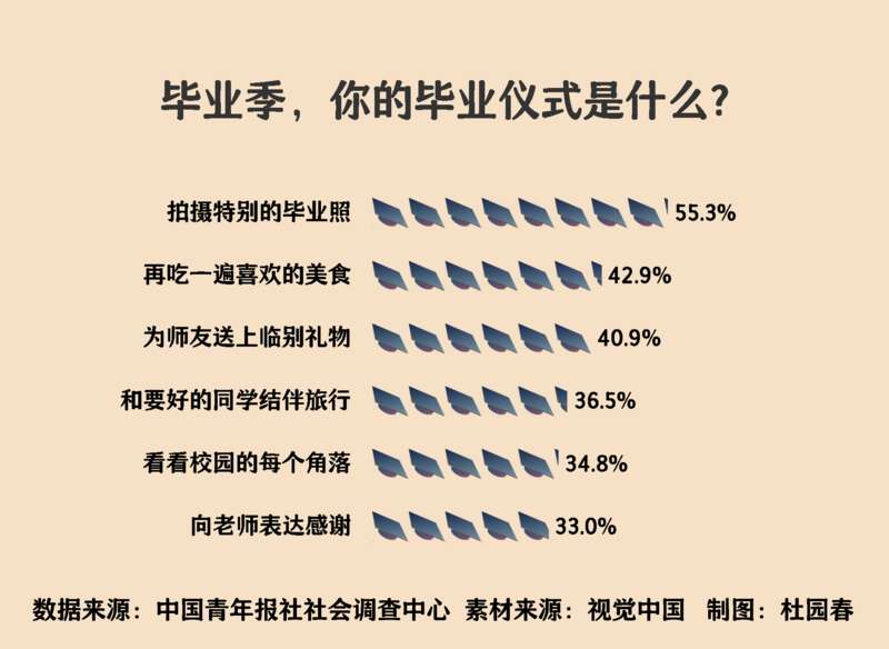 近日,中国青年报社社会调查中心联合问卷网(wenjuan.com),对1334名今年的大学毕业生进行的一项调查显示,55.3%的受访毕业生拍摄了特别的毕业照,42.9%的受访毕业生再吃了一遍喜欢的美食,40.9%的受访毕业生为师友送上了临别礼物。