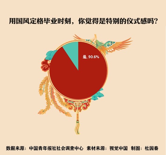 上周,中国青年报社社会调查中心联合问卷网(wenjuan.com),对1334名今年的毕业生进行的一项调查显示,90.6%的受访毕业生觉得用国风定格毕业时刻是特别的仪式感,本科受访毕业生对此最有感触。61.6%的受访毕业生认为国风元素在毕业季的火爆,体现出大家对中华传统文化的认同。