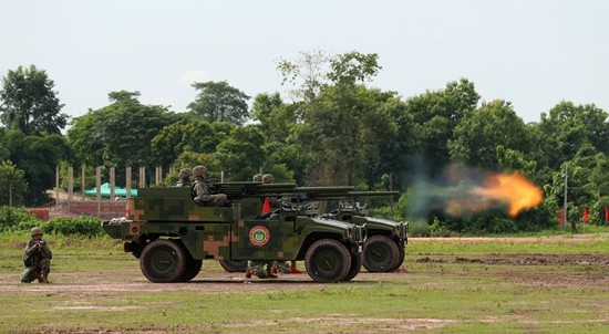 7月9日,老挝库玛丹学院训练场,中老“友谊盾牌-2024”联演组织车载速射迫击炮实弹射击训练。易定/摄