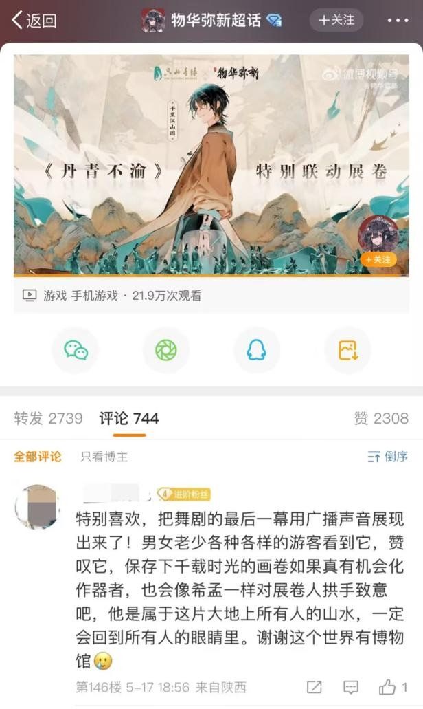 早在《物华弥新》与《国家宝藏》达成合作之前,《物华弥新》的创新型古物文化表现形式就已备受文博界认可,古物的虚拟形象早在2021年就已登上《国家宝藏·展演季》的节目舞台,与观众见面;上线期间与舞蹈诗剧《只此青绿》进行联动,一起宣传千古名画《千里江山图》,联动PV播放量达450万,评论区里玩家们感情真挚的留言给人留下深刻印象。