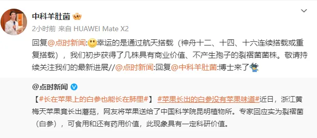 中国科学院昆明植物研究所正高级工程师赵琪@中科羊肚菌 表示,苹果上长菌的现象可能对苹果种植产生的影响,并且长出的白参不会有苹果味道。