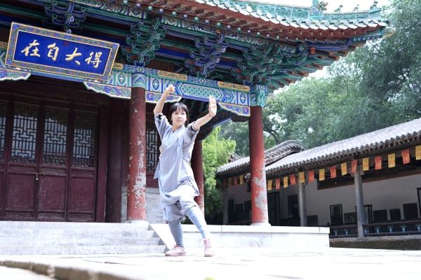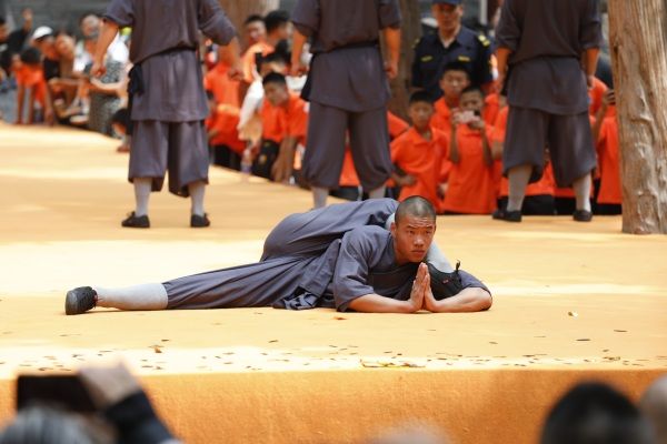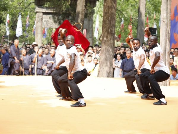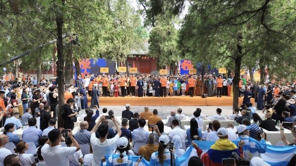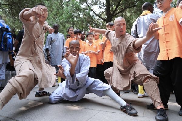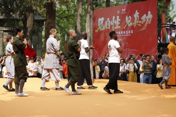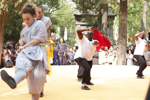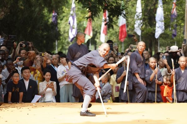 2024年7月13日,河南登封,2024少林考功总决赛在中国嵩山少林寺开赛,来自47个国家和地区的逾百位少林功夫习练者展开现场角逐,争夺“2024世界少林功夫之星”。图为少林“洋弟子”在开幕式上进行功夫展示。 中新社记者 阚力 摄
