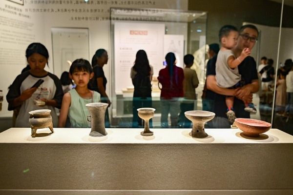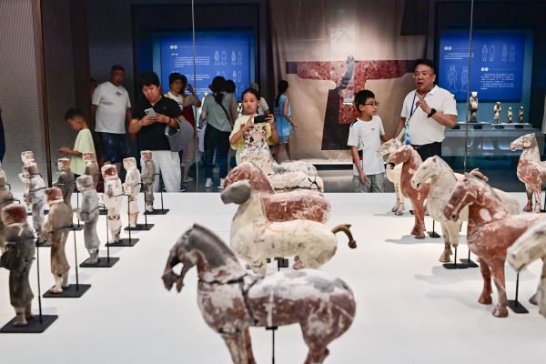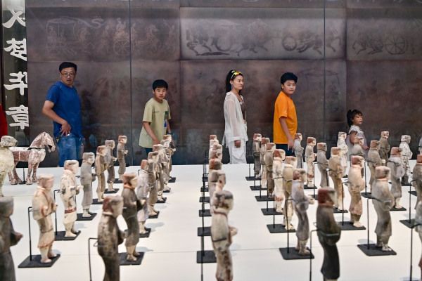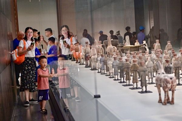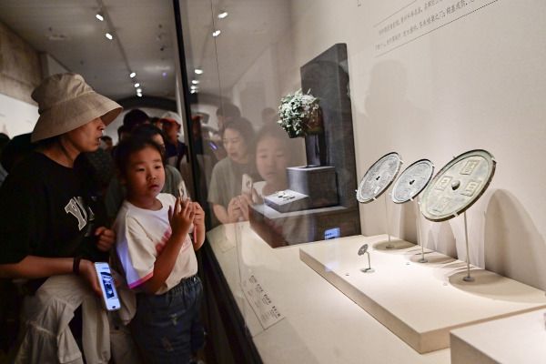 2024年7月13日,学生们在山东省潍坊市青州博物馆观看文物展览。