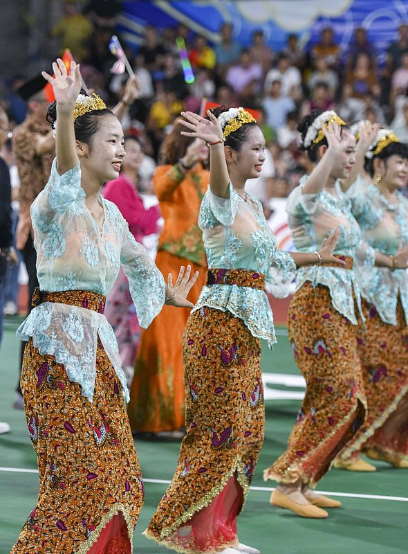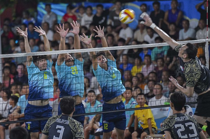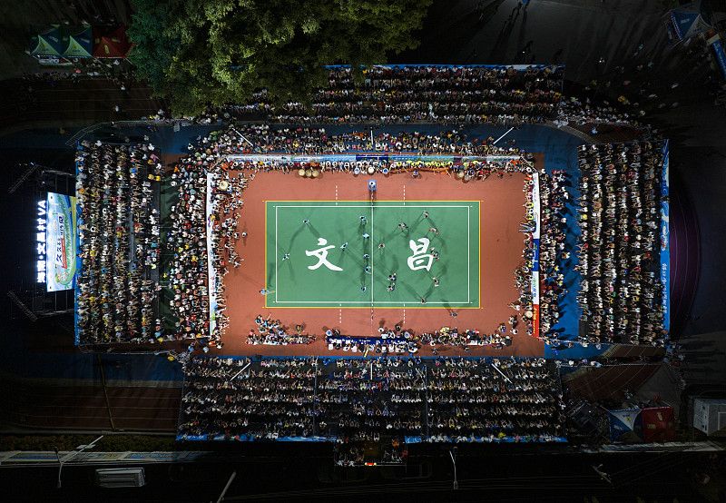 2024年7月13日晚,海南文昌,2024年“九九杯”海南(文昌)乡镇排球联赛铺前站迎来一场中马排球友谊赛,由文昌火箭队(蓝)对阵马来西亚华侨排球队(黑)。经过激烈角逐,最终文昌火箭队3:1战胜马来西亚华侨排球队。(无人机照片) 中新社记者 骆云飞 摄