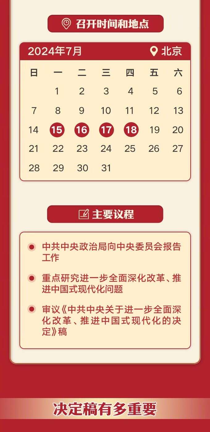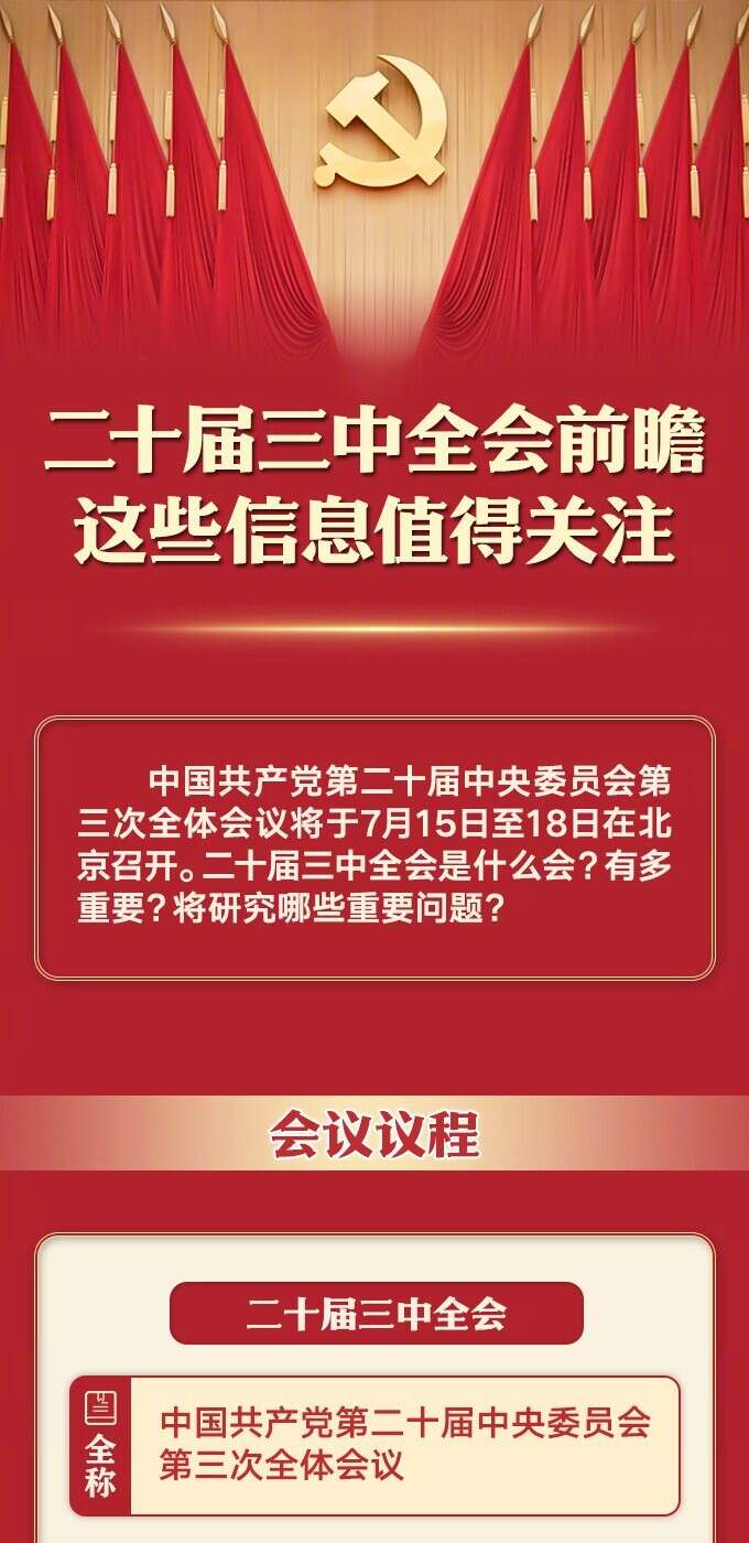 中国共产党第二十届中央委员会第三次全体会议将于7月15日至18日在北京召开。二十届三中全会主要议程是什么 ?将研究哪些重要问题?收藏,了解,学习。(人民日报客户端)