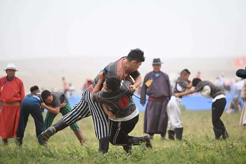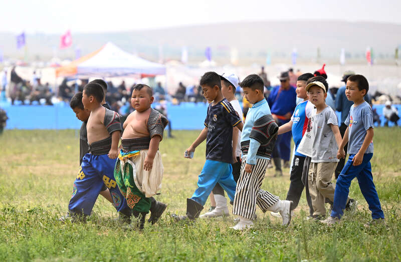 7月15日,在内蒙古自治区第34届草原那达慕上开设了少年那达慕搏克比赛项目,共有128名13岁以下的少年搏克手参赛。中青报·中青网记者 石佳/摄