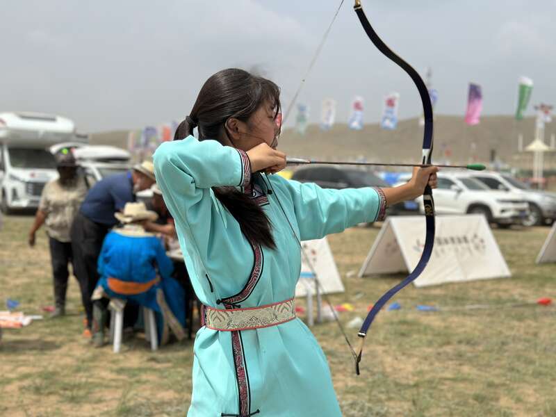 7月15日,今年15岁的娜荷雅正在练习射箭,为少年那达慕射箭比赛做准备。中青报·中青网记者 石佳/摄