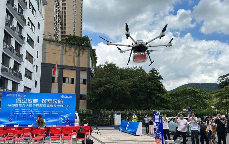 这架无人机搭载的4封通知书,既是华南理工大学2024年第一批寄出的本科录取通知书,也是广州邮政今年配送的广州高校第一批录取通知书。据了解,广州邮政服务高校录取通知书40余年,每年大概需要配送约55万封录取通知书。今年结合低空经济模式,率先探索无人机配送方式。