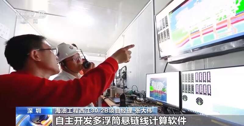 海油工程西江30-2B项目经理 张大伟:项目团队应用数字化工具进行三维建模和计算分析,精准设计浮托技术方案,自主开发多浮筒悬链线计算软件,对系泊布置进行反复优化,浮托作业过程中,通过多拖轮联动控船,实现上部组块一次精准就位。