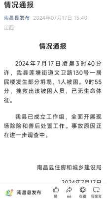 2024年7月17日凌晨3时40分许,南昌县莲塘街道文卫路130号一居民楼发生部分坍塌,1人被困。9时55分,搜救出该被困人员,已无生命体征。