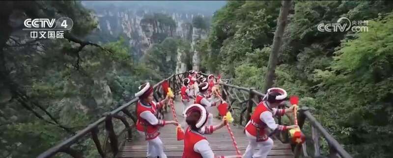 除了沉浸式表演,非遗性质的民俗文化在这个暑假也深受游客喜爱。连日来,在张家界国家森林公园大氧吧广场、黄石寨顶等地,非遗演出火热进行,为中外游客带来了土家草龙舞、土家茅古斯舞、白族仗鼓舞等,让游客们在自然山水间,欣赏原汁原味的民俗文化“大餐”。