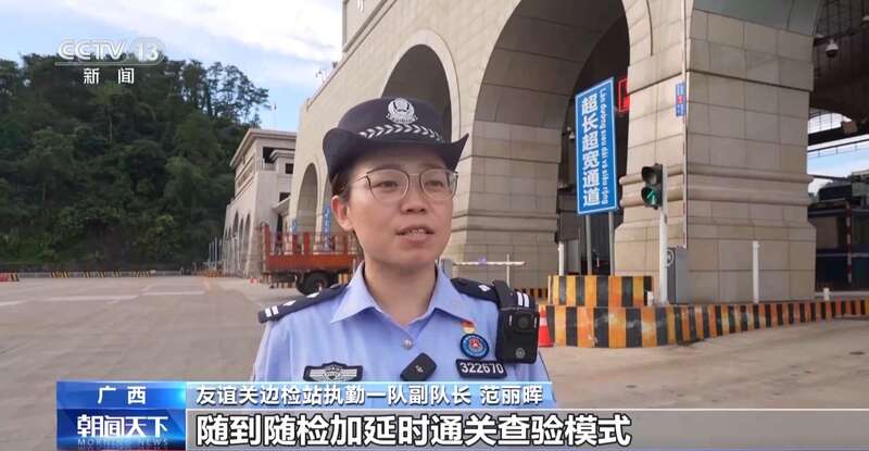 友谊关边检站执勤一队副队长 范丽晖:我们目前对生鲜采取的是“随到随检+延时通关”查验模式,一辆中方货车在查验环节需要15秒即可快速通关。