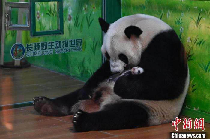 中新社广州7月18日电 (王华 邓泳怡)全球唯一大熊猫三胞胎中的大姐“萌萌”上月顺利产下一胎雌性幼崽。7月18日,广州长隆野生动物世界为“萌二代”举办满月仪式。短短一个月时间,大熊猫幼崽身上的被毛已黑白分明,其软萌模样继承了家族的美貌。