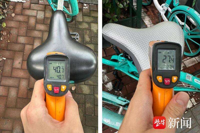 记者于下午两点在庐山路找到了装有防烫坐垫的共享单车并使用测温枪测试,在32℃气温下,普通的共享单车坐垫温度为40.7℃,而配备了防烫坐垫的共享单车坐垫温度仅有27.4℃,降温效果明显。随后,记者亲身体验,手掌接触暴露在阳光下的普通共享单车座椅时,有明显灼热感。体验防烫坐垫时,灼热感减弱。
