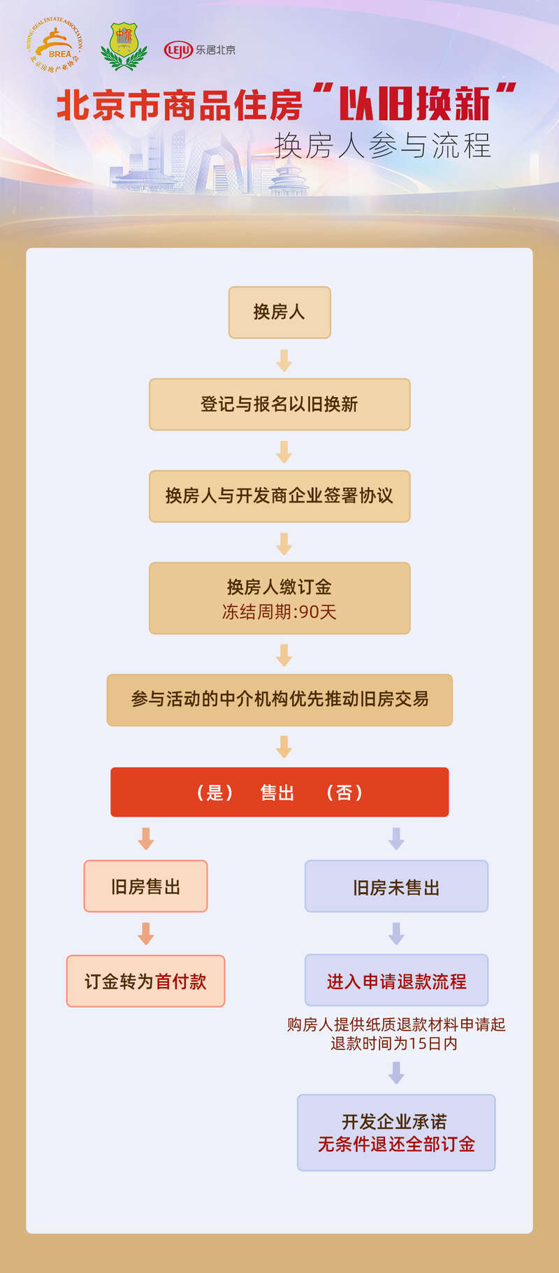 北京房地产业协会、北京房地产中介行业协会联合发出《北京市商品住房“以旧换新”活动倡议书》,参与活动的房地产开发企业承诺,在90天内,旧房未成功出售的,购房居民可无条件申请退还订金,退款时间不超过15天;参与活动的房地产经纪机构承诺,对购房居民的旧房“全城推、优先卖”;参与活动的房地产租赁企业承诺,对购房居民在换房过渡期间的租赁需求加大租房优惠力度。本次活动持续至12月31日。
