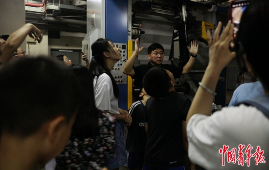 在中国青年报社印刷厂副厂长尚闻天的带领下,小朋友和家长们走进印厂,参观有两三层楼高的印刷设备,学习报纸印刷原理。中青报印厂从创建至今已经有70多年的历史。1953年,已创刊两年的中国青年报社决定自建印刷厂;1999年6月初,中国青年报社引进了亚洲首条德国高宝科美特全自动高速多色印报生产线;2022年6月30日,中青报印厂关停机器,不再承接印报业务。