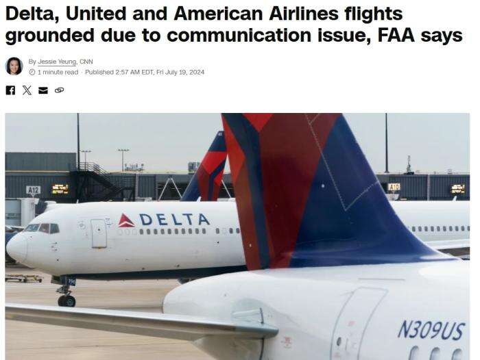 据美国有线电视新闻网(CNN)报道,美国联邦航空管理局称,由于通讯问题,包括达美航空、联合航空和美国航空在内的多家美国主要航空公司的所有航班于当地时间19日上午停飞。