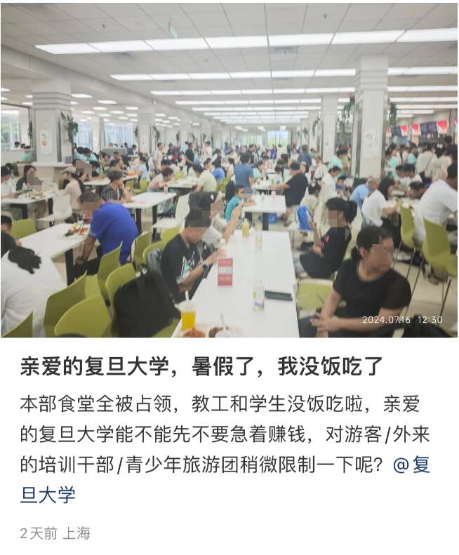 暑期复旦大学校园迎来参观、培训高峰。在食堂就餐的校外人士太多,导致本校师生就餐困难↓