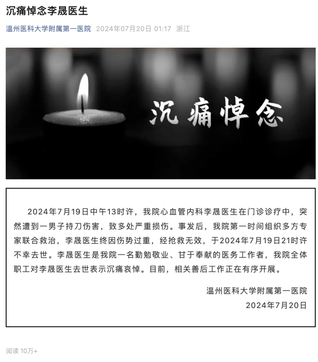 7月20日凌晨,温州医科大学附属第一医院官微发布悼文《沉痛悼念李晟医生》: