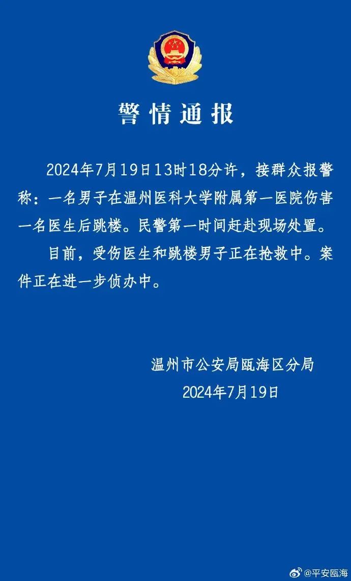 据警方通报:2024年7月19日13时18分许,按群众报警称,一名男子在温州医科大学附属第一医院伤害一名医生后跳楼。民警第一时间赶赴现场处置。案件正在进一步侦办中。
