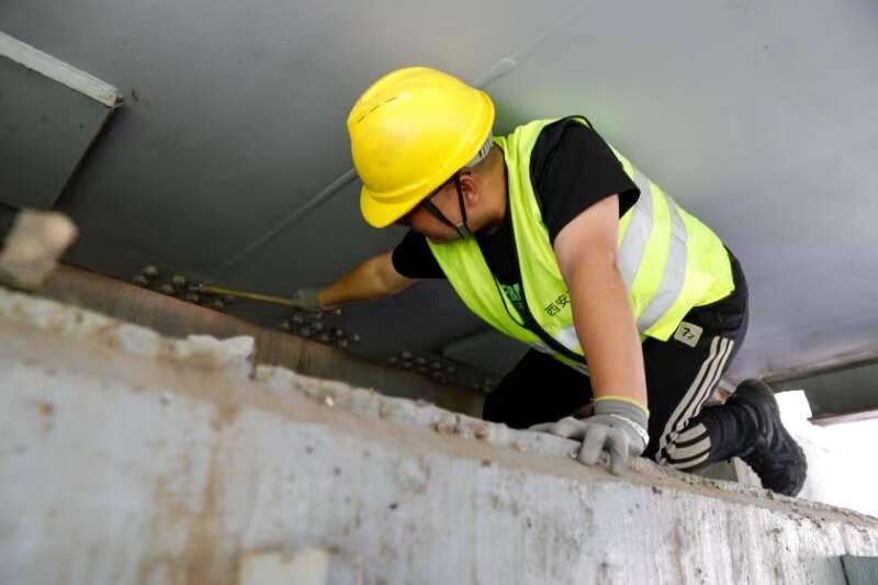 “我太胖了,别人蹲着检查,我得跪着。”体重180斤的工长周立刚笑着说,“桥下高不到50公分的桥墩空间,每个人都得爬下去检查支座的水泥有没有裂缝、掉块。”