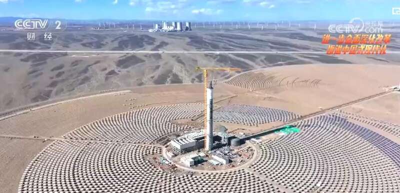 总台央视记者古峻岭介绍,这里是全球首个“双塔一机”光热储能电站,目前主体工程已经进入调试阶段。它不仅在有阳光时可以正常发电,还可以借助熔盐将多余的太阳能储存起来,实现24小时稳定不间断的电力输出。
