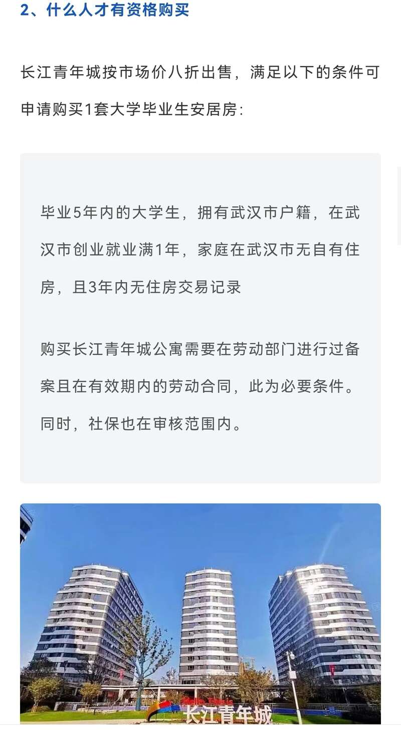 长江青年城微信公众号相关推送也显示,当时长江青年城售卖的标准是:毕业五年内的大学生,拥有武汉市户籍,在武汉创业就业满一年,家庭在武汉无自住房且三年内无住房交易记录。