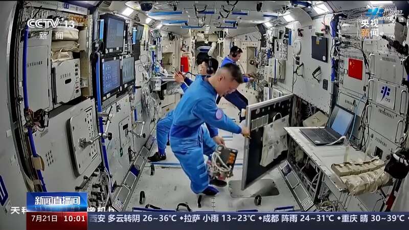 在空间科学实(试)验方面,除完成无容器柜、流体物理柜实验样品更换等多项工作外,乘组对燃烧科学实验柜中实验插件的过滤窗进行了更换,为后续相关实验开展做准备。
