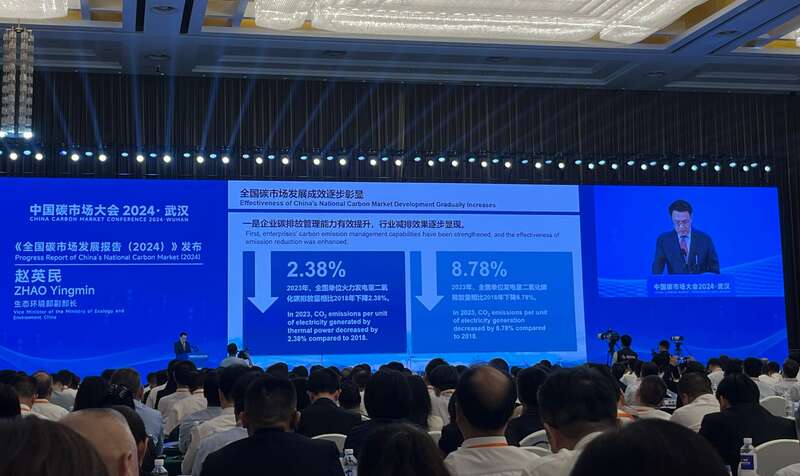 赵英民介绍了一组数字:在保障电力行业快速发展、能源安全的前提下,2023年全国火电碳排放强度较2018年下降2.38%,电力碳排放强度较2018年下降8.78%,“通过碳市场推动温室气体减排,促进能源结构调整,激励先进、约束落后的导向作用更加明显”。