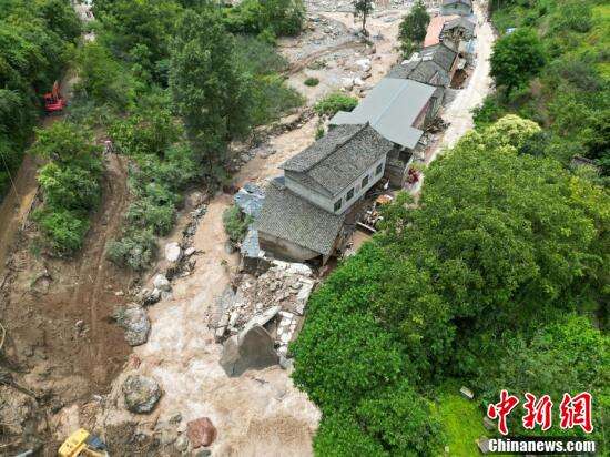 7月21日,四川汉源,航拍新华村山洪暴雨灾害现场。7月20日凌晨2时30分许,雅安市汉源县马烈乡新华村因暴雨突发山洪灾害,造成30余人失联,40余处房屋受损,目前已找到8名遇难者。
