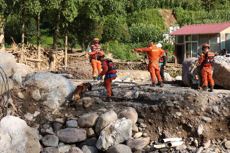 7月22日下午,来自四川省凉山州森林消防支队的消防救援人员携带搜救犬,在马烈乡的河道附近搜寻失联人员。中青报·中青网记者 王鑫昕/摄