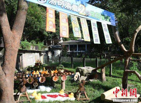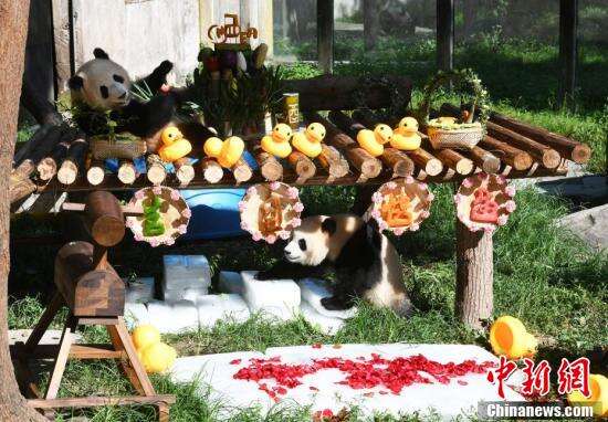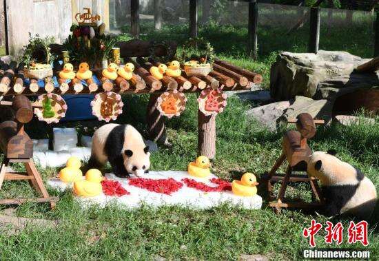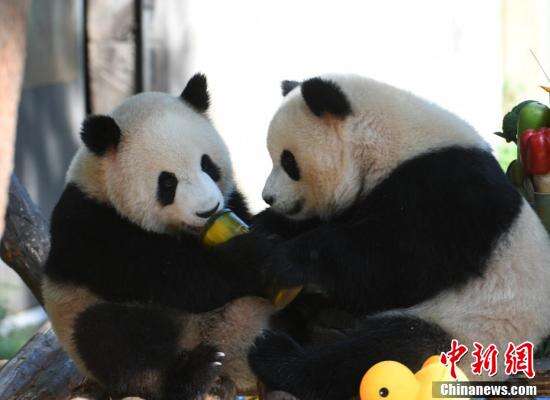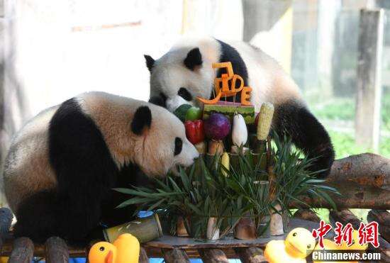 中新社记者 周毅 摄大熊猫“渝可”“渝爱”在生日会现场。