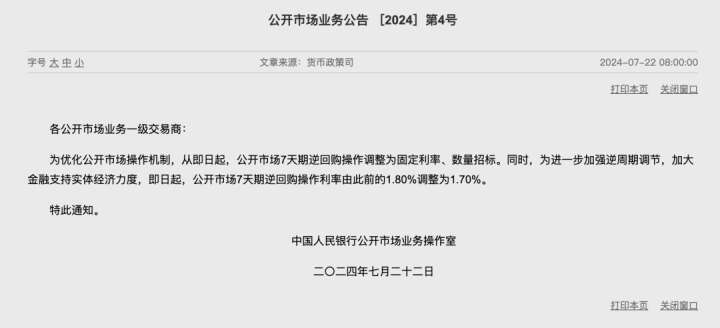 除了招标方式调整,本次公开市场7天期回购操作利率还由前次的1.8%降至1.7%,是2023年8月以来首次调整。