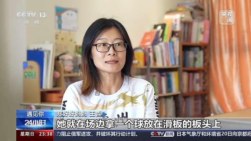郑好好妈妈 王哲:第一次参加全国性的赛事,全国锦标赛,那次她已经是非常松弛的状态,姐姐们都在后面认真练习。她就在场边拿一个球放在滑板的板头上。啪,一踩那个滑板,球就弹到她的怀里,她笑得咯咯咯的,玩得不亦乐乎。
