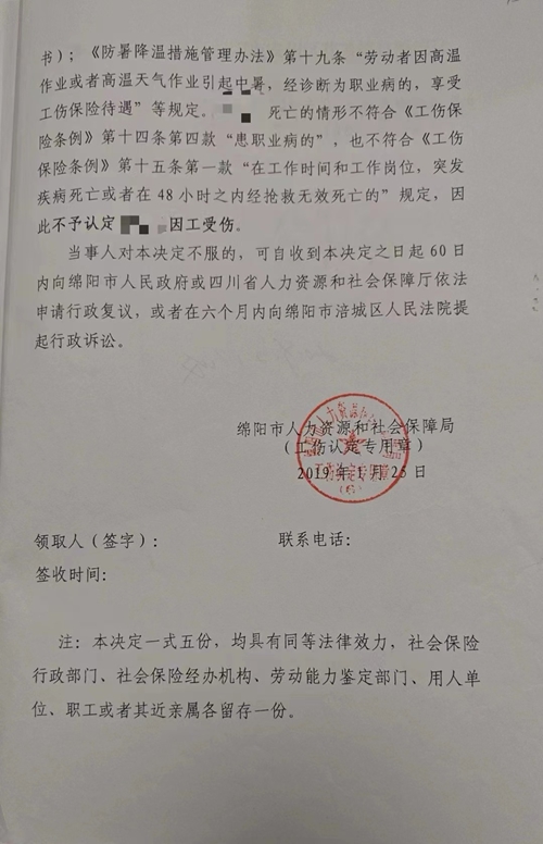 2019年1月25日,绵阳市人力资源和社会保障局作出不予认定工伤决定。受访者供图