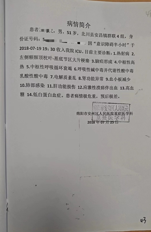 2018年7月25日,绵阳市安州区人民医院为罗义开具的病情简介。受访者供图