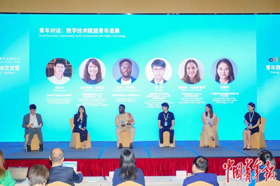 7月16日上午,广州市黄埔区,院士港。2024世界青年发展论坛青年数字领袖研修交流营当天开营。在数字青年对话环节上,围绕“数字技术赋能青年发展”主题,多位专家与中外青年代表进行了面对面交流。中青报·中青网记者 魏婉/摄