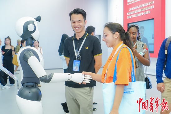 7月16日下午,广州市黄埔区,广州开发区规划展示馆。一款机器人产品成为当天的“明星展品”,孟加拉国“更好的故事”有限公司创新与业务发展助理苏迈雅·费尔多斯开心地上前与它对话、握手,并认真观赏了它的舞蹈表演。中青报·中青网记者 魏婉/摄