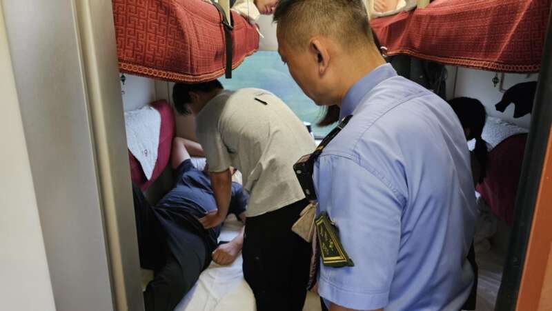 此时,一名40多岁的男子侧身躺在卧铺上,一只手捂着左下腹,眉头紧锁,看起来很痛苦。