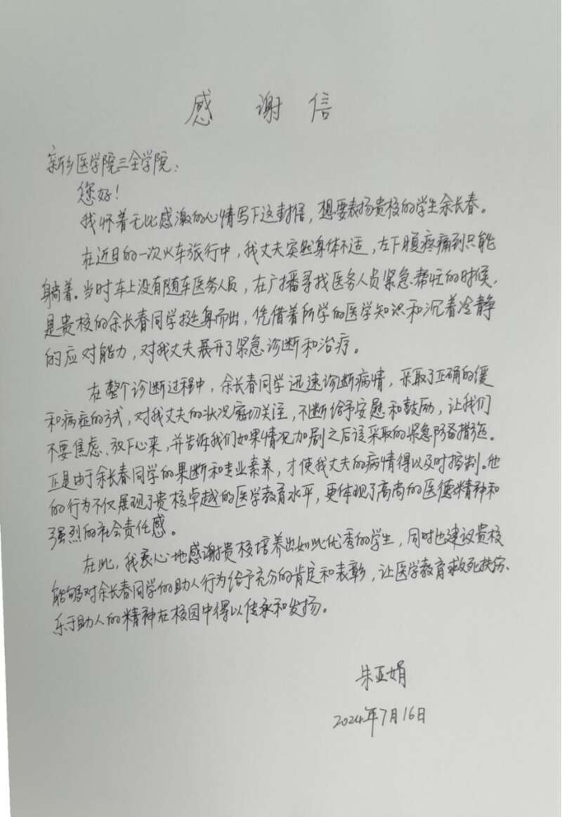 “当时车上没有随车医务人员,在广播寻找医务人员紧急帮忙的时候,是贵校的余长春同学挺身而出,凭借着所学的医学知识和沉着冷静的应对能力,对我丈夫展开了紧急诊断和治疗。”7月23日上午,郑州市民朱亚娟女士饱含感激之情手写的一封感谢信,寄到了新乡医学院三全学院仁智书院。