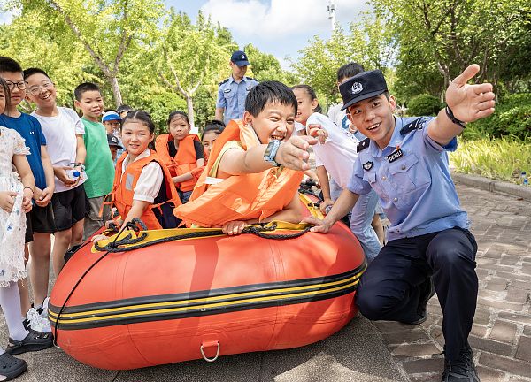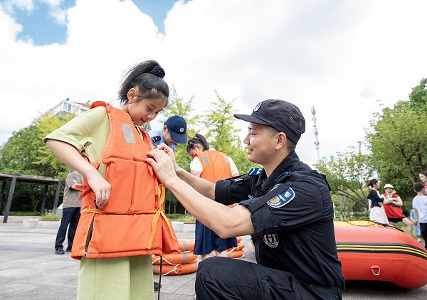 2024年7月25日,江苏省南通市,为切实提高青少年暑期防溺水安全意识,通州区公安局巡特警大队联合开发区派出所在金新街道碧华社区开展夏季防溺水宣传教育活动。民警辅警通过向学生讲解溺水危害和预防措施,现场教学穿戴救生衣、使用救生圈,模拟体验乘坐救生艇等,提升青少年防溺水意识和自救能力。